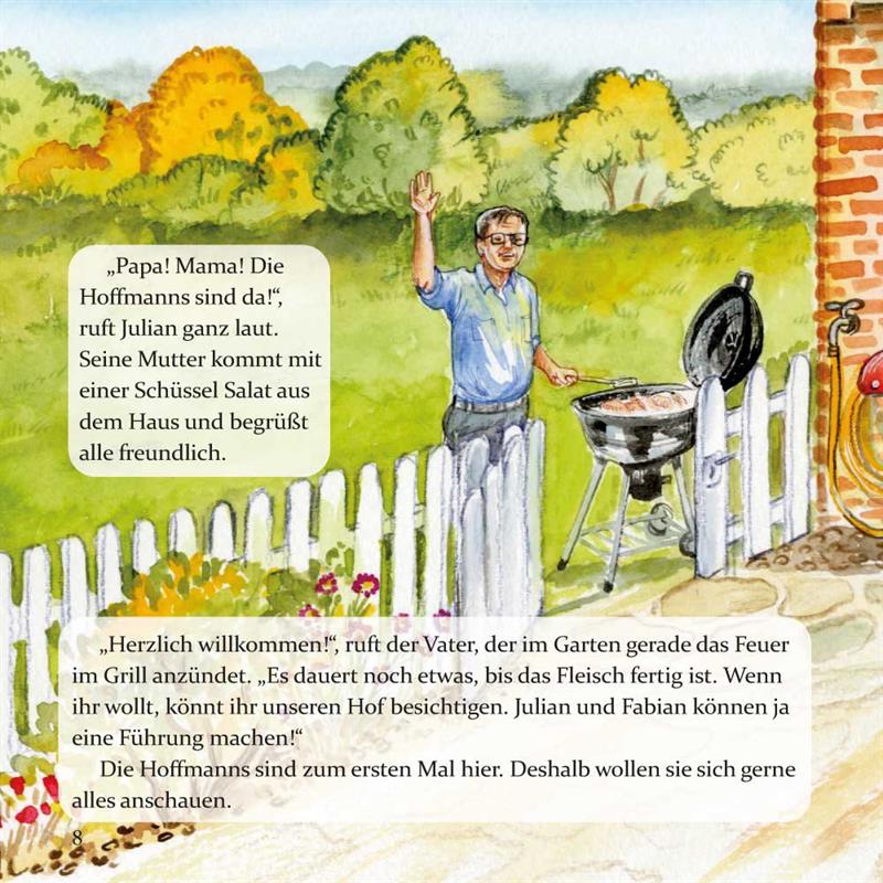 Die Hoffmanns sind bei Familie Langemann zu einem Grillnachmittag eingeladen. Familie Langemann wohnt auf einem großen, alten Bauernhof. Vor dem Essen besichtigen sie noch den Hof. Dabei kommen sie auch am Misthaufen vorbei. Dazu erzählt Opa Langemann später noch eine interessante Geschichte ...