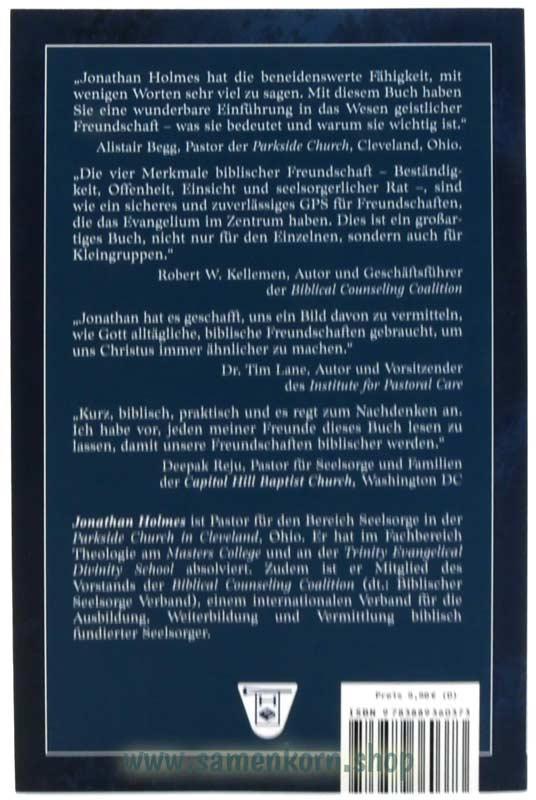 "Jonathan Holmes hat die beneidenswerte Fähigkeit, mit wenigen Worten sehr viel zu sagen. Mit diesem Buch haben Sie eine wunderbare Einführung in das Wesen geistlicher Freundschaft – was sie bedeutet und warum sie wichtig ist." –Alistair Begg, Pastor der Parside Church, Cleveland, Ohio.