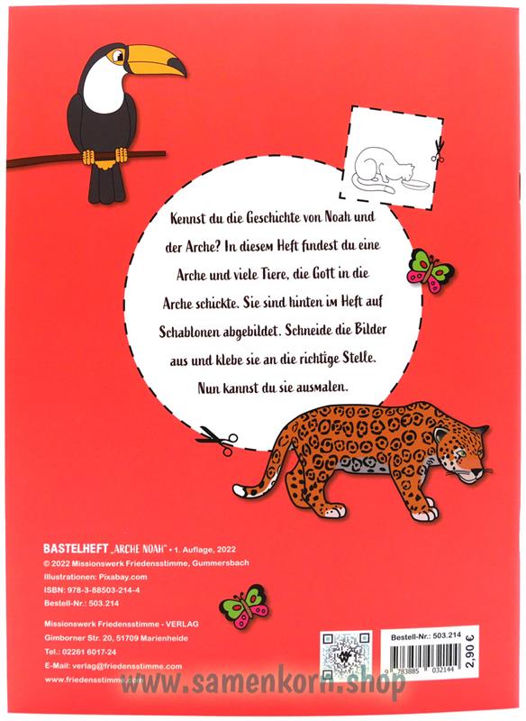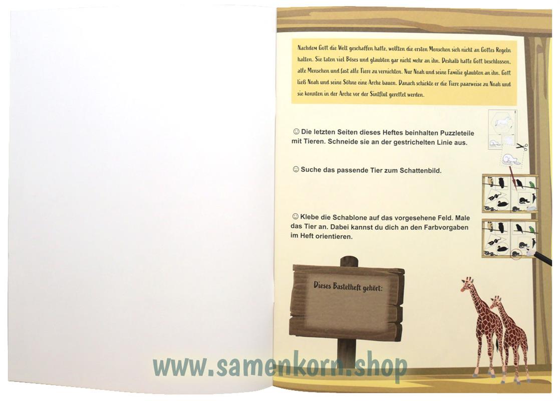 Kennst du die Geschichte von Noah und der Arche? In diesem Heft findest du eine Arche und viele Tiere, die Gott in die Arche schickte. Sie sind hinten im Heft auf Schablonen abgebildet. Schneide die Bilder aus und klebe sie an die richtige Stelle. Nun kannst du sie ausmalen.