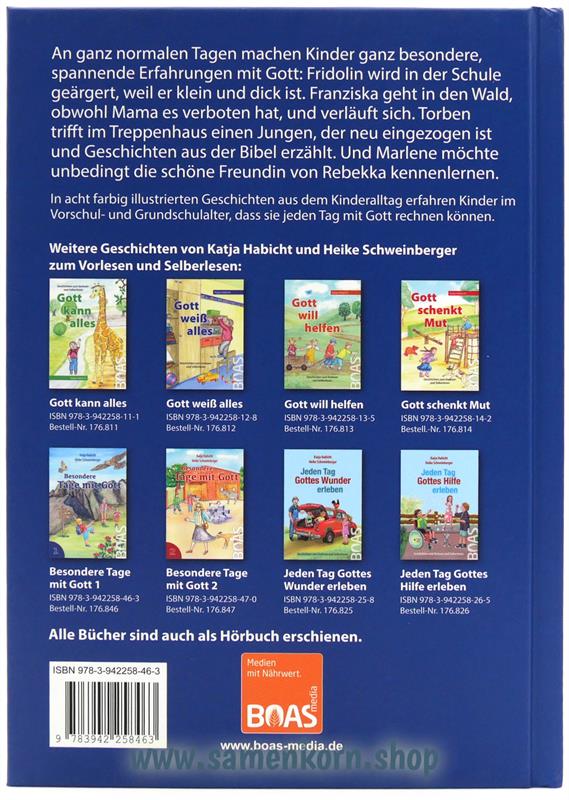 An ganz normalen Tagen machen Kinder ganz besondere Erfahrungen mit Gott: Fridolin wird in der Schule geärgert, weil er klein und dick ist. Franziska geht in den Wald, obwohl Mama es verboten hat, und verläuft sich. Torben trifft im Treppenhaus einen Jungen, der neu eingezogen ist und Geschichten aus der Bibel erzählt. Und Marlene möchte unbedingt die schöne Freundin von Rebekka kennenlernen.