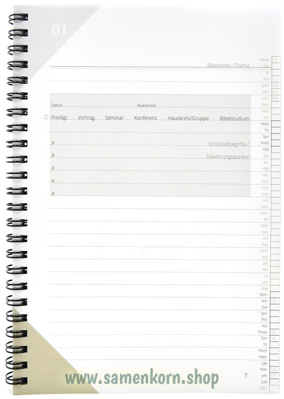Dieses Notizbuch bietet eine praktische Hilfe, um bei Predigten und auch beim eigenen Bibelstudium das Gelernte zu ordnen und festzuhalten.