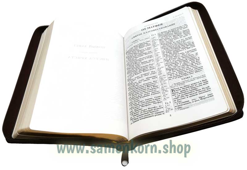 Синодальный перевод, стандартный формат. Pасположение текста: набор в 2 колонки, указатель параллельных мест посередине страницы.