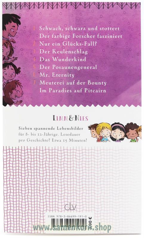 In diesem Buch findest du sieben spannende Lebensbilder mit den Titeln »Schwach, schwarz und stottert«, »Der farbige Forscher fasziniert«, »Nur ein Glücks-Fall?«, »Der Keulenschlag«, »Das Wunderkind«, »Der Posaunengeneral«, »Mr. Eternity«, »Meuterei auf der Bounty«, »Im Paradies auf Pitcairn«.