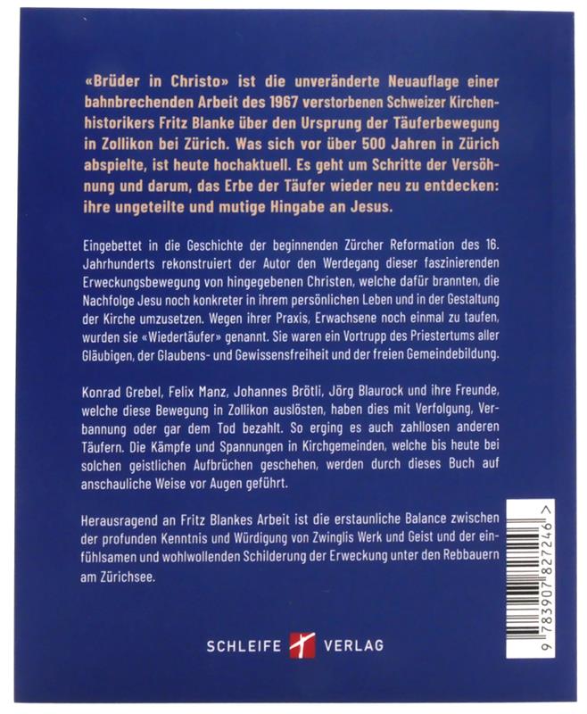 "Brüder in Christo" ist die unveränderte Neuauflage einer bahnbrechenden Arbeit des 1967 verstorbenen Schweizer Kirchenhistorikers Fritz Blanke über den Ursprung der Täuferbewegung in Zollikon bei Zürich.