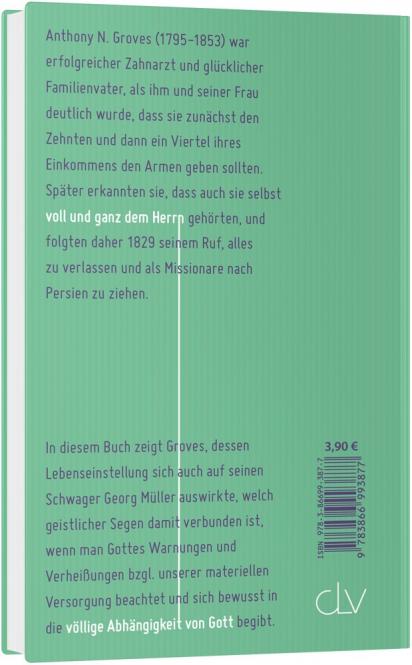 A. N. Groves (1795-1853) war erfolgreicher Zahnarzt und glücklicher Familienvater, als ihm und seiner Frau deutlich wurde, dass sie zunächst den Zehnten und dann ein Viertel ihres Einkommens den Armen geben sollten. Später erkannten sie, dass auch sie selbst voll und ganz dem Herrn gehörten, und folgten daher 1829 seinem Ruf, alles zu verlassen und als Missionare nach Persien zu ziehen. In diesem Buch zeigt Groves, dessen Lebenseinstellung sich auch auf seinen Schwager Georg Müller auswirkte, welch geistlicher Segen damit verbunden ist, wenn man Gottes Warnungen und Verheißungen bzgl. unserer materiellen Versorgung beachtet und sich bewusst in die völlige Abhängigkeit von Gott begibt.