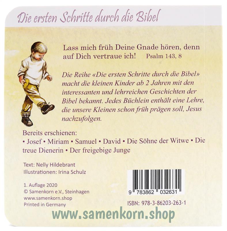 Die ersten Schritte durch die Bibel Kinder der Bibel   Die Pappbuch-Reihe macht kleinen Kindern ab 2 Jahren mit den interessanten und lehrreichen Geschichten der Bibel bekannt. Jedes Büchlein enthält eine Lehre, die unsere Kleinen dazu ermutigt, Gott zu vertrauen.   Enthalten: Josef Miriam Samuel David Die Söhne der Witwe Die treue Dienerin Der freigebeige Junge   7 Pappbücher im Set
