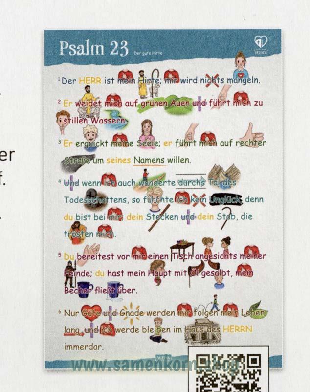 Poster mit dem Text aus Psalm 23. Fast jedes Wort ist mit Bildchen hinterlegt, die helfen sollen, den Bibeltext besser auswendig zu lernen.