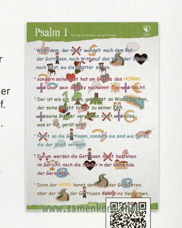 Poster mit dem Psalm 1. Fast jedes Wort ist mit Bildchen hinterlegt, die helfen sollen, den Bibeltext besser auswendig zu lernen.