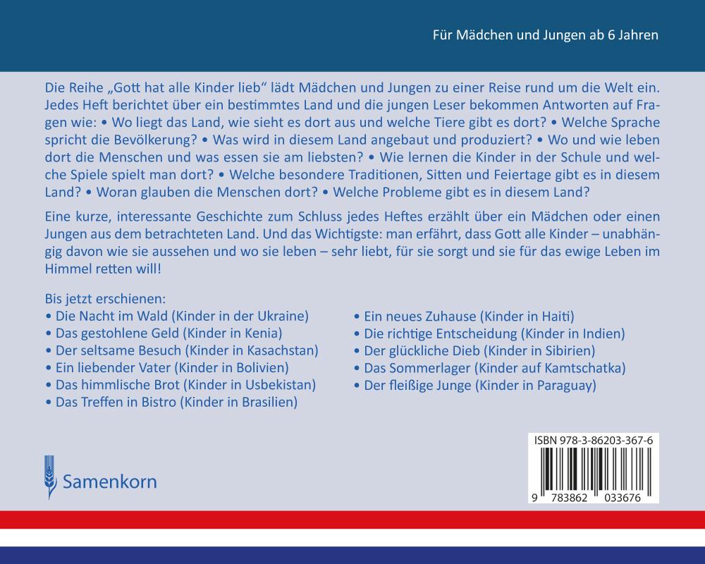 In den Heften der Reihe "Gott hat alle Kinder lieb" bekommt der Leser wissenswerte Fakten über die Lebensweise, sowie Flora und Fauna des jeweiligen Landes und ein landestypisches Rezept lädt zum Nachbacken oder -kochen ein. Eine kurze interessante Geschichte zum Schluss jedes Heftes erzählt über ein Mädchen oder einen Jungen aus dem betrachteten Land. Und das Wichtigste: man erfährt, dass Gott alle Kinder - unabhängig davon wie sie aussehen und wo sie leben - sehr liebt, für sie sorgt und sie für das ewige Leben im Himmel retten will!