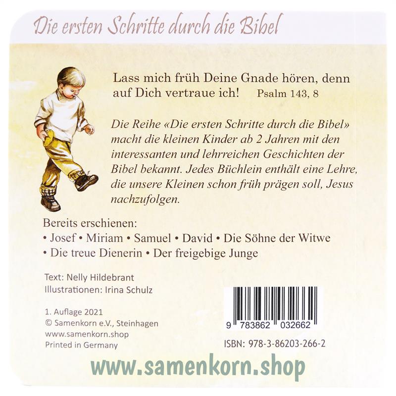 Der kleine Samuel lebt im Tempel Gottes bei dem Priester Eli. Eines Nachts wird er von einer Stimme wach, die seinen Namen ruft. Doch es ist nicht Eli der ihn ruft, sondern Gott selbst ... Dieses Pappbuch erzählt die biblische Geschichte von Samuel in kindergerechten Worten, umrahmt mit wunderschönen Bildern.   Die Reihe "Die ersten Schritte durch die Bibel" macht die kleinen Kinder ab 2 Jahren mit den interessanten und lehrreichen Geschichten der Bibel bekannt. Jedes Büchlein enthält eine Lehre, die unsere Kleinen dazu ermutigt, Gott zu vertrauen.