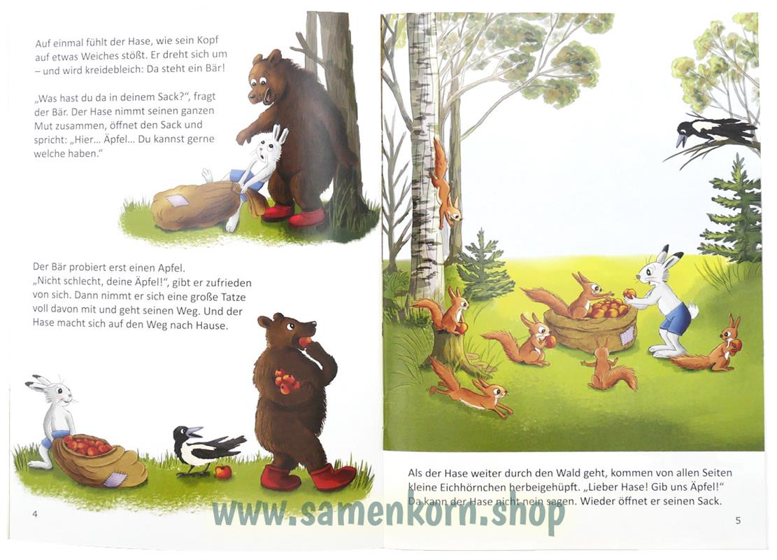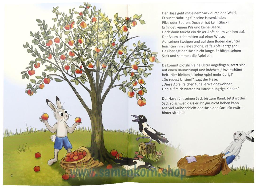 Einen Sack voller Äpfel schleppt der Hase nach Hause. Hungrige Kinder warten dort auf ihn. Doch unterwegs teilt er seine Apfelernte mit anderen Tieren. Als der Hase endlich zu Hause ankommt, ist sein Sack leer. Doch seine Kinder liegen satt und zufrieden im Bett. Wie das wohl geht?