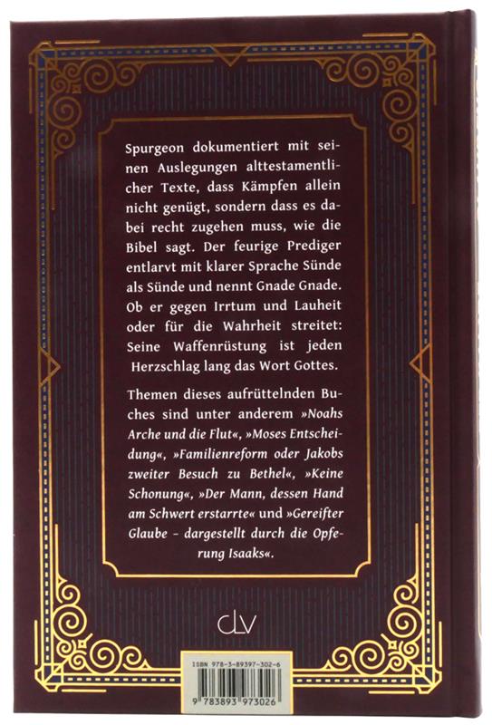 Spurgeon dokumentiert mit seinen Auslegungen alttestamentlicher Texte, dass Kämpfen allein nicht genügt, sondern dass es dabei recht zugehen muss, wie die Bibel sagt. Der feurige Prediger entlarvt mit klarer Sprache Sünde als Sünde und nennt Gnade Gnade. Ob er gegen Irrtum und Lauheit oder für die Wahrheit streitet: Seine Waffenrüstung ist jeden Herzschlag lang das Wort Gottes.