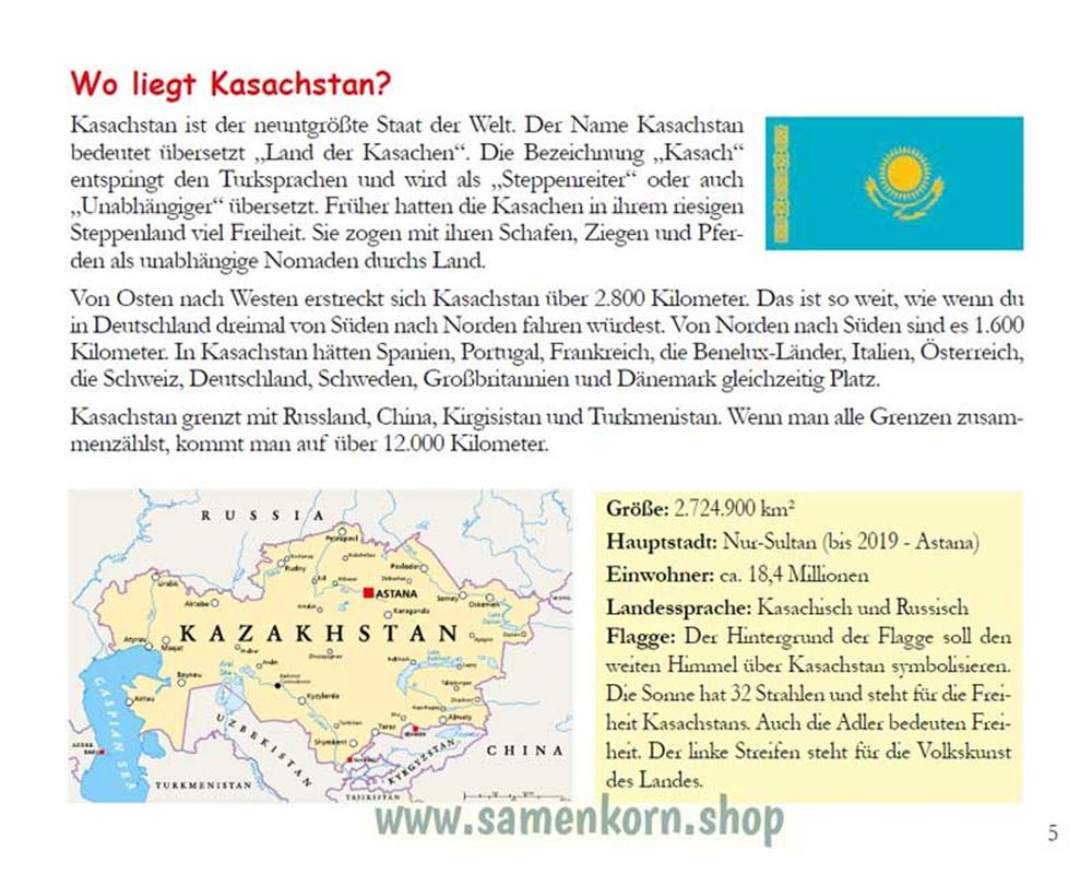 Kinder in Kasachstan - englisch   Aischan lebt mit ihren Eltern und Geschwistern in einem kasachischen Dorf. Eines Tages besuchen den Aul seltsame Leute, die auf dem Dorfplatz ein großes Zelt aufbauen. „Soll das eine Diskothek werden?“, fragten sich die Kinder. Aber dann erfahren sie, mit welchem Vorhaben diese Menschen ins Dorf gekommen sind ...   In den Heften der Reihe "Gott hat alle Kinder lieb" bekommt der Leser wissenswerte Fakten über die Lebensweise, sowie Flora und Fauna des jeweiligen Landes und ein landestypisches Rezept lädt zum Nachbacken oder -kochen ein. Eine kurze interessante Geschichte zum Schluss jedes Heftes erzählt über ein Mädchen oder einen Jungen aus dem betrachteten Land. Und das Wichtigste: man erfährt, dass Gott alle Kinder - unabhängig davon wie sie aussehen und wo sie leben - sehr liebt, für sie sorgt und sie für das ewige Leben im Himmel retten will!   Heft, in englischer Sprache   God Loves all Children The Strange Visit Children in Kazakhstan   Aishan lives together with her familiy in a kazakh village. One day they are visited by strange people, who build a large tent in the center of the village. The children wonder why these people came to them...   This book teaches the young readers: Where is Kazakhstan, what does it look loke, and which animals live there? What language do Kazakh people speak? What does Kazakhstan produce? How do Kazakhs live and what do they eat? What do children learn at school and what games do they play? Which special traditions, customs and celebrations are there? What do Kazakh people believe in? Which problems does Kazakhstan face?   But what is most important: You learn that God loves all children, no matter what they look like or where they live! He cares for them and wants to save them for eternal life in heaven!