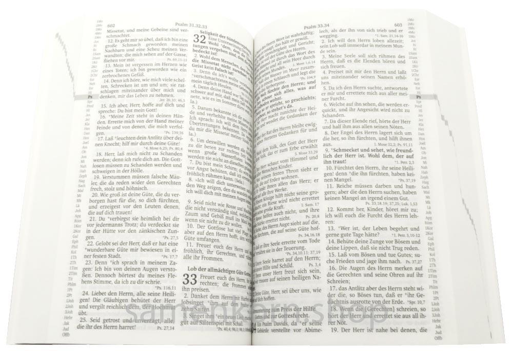 Die Bibel enthält zudem eine Bibelleseanleitung von August Hermann Francke, ein Inhaltsverzeichnis und Alphabetisches Verzeichnis. Im Anhang finden Sie eine Auflistung der Kirchensonntage mit empfohlenen Bibeltextlesungen, Wegweisungen in der Heiligen Schrift und ein Bibelleseplan.