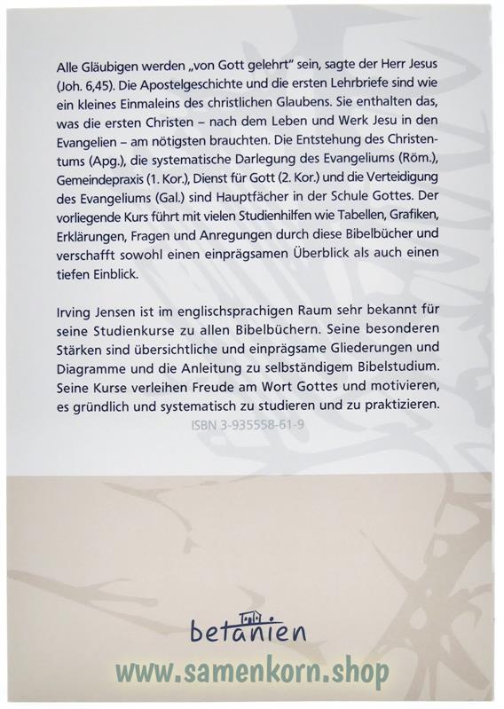 Alle Gläubigen werden "von Gott gelehrt" sein, sagte der Herr Jesus (Joh. 6,45). Die Apostelgeschichte und die ersten Lehrbriefe sind wie ein kleines Einmaleins des christlichen Glaubens. Sie enthalten das, was sie ersten Christen - nach dem Werk Jesu in den Evangelien - am nötigsten brauchten. Die Entstehung des Christentums (Apg.), die systematische Darlegung des Evangeliums (Röm.), Gemeindepraxis (1. Kor.), Dienst dür Gott (2. Kor.) und die Verteidigung des Evangeliums (Gal.) sind Hauptfächer in der Schule Gottes. Der vorliegende Kurs führt mit vielen Studienhilfen wie Tabellen, Grafiken, Erklärungen, Fragen und Anregungen durch diese Bibelbücher und verschafft sowohl einen einprägsamen Überblick als auch einen tiefen Einblick.