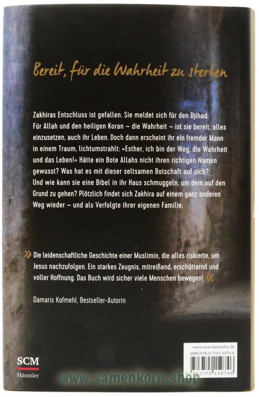 Doch dann erscheint ihr ein fremder Mann in einem Traum, lichtumstrahlt: "Esther, ich bin der Weg, die Wahrheit und das Leben!" Hätte ein Bote Allahs nicht ihren richtigen Namen gewusst? Was hat es mit dieser seltsamen Botschaft auf sich? Und wie kann sie eine Bibel in ihr Haus schmuggeln, um dem auf den Grund zu gehen? Plötzlich findet sich Zakhira auf einem ganz anderen Weg wieder – und als Verfolgte ihrer eigenen Familie. Doch der Herr macht seine Verheißungen auch in ihrem Leben wahr.