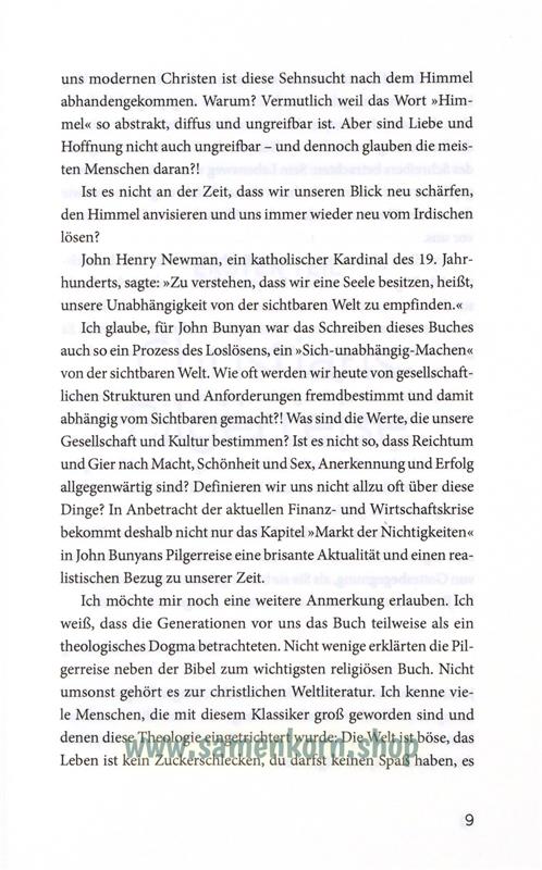 Seit über 300 Jahren prägt John Bunyans kraftvolle Allegorie "Die Pilgerreise" den Glauben vieler Christen. Sie erzählt die zeitlose Geschichte von Christian, der auf seinem Weg in die himmlische Stadt mit vielen Hindernissen und Gefahren zu kämpfen hat. Doch es ist viel mehr als eine Allegorie: Es ist einerseits die persönliche Geschichte des Kesselflickers Bunyan und andererseits die Geschichte eines jeden von uns, der die gleiche Reise unternimmt und weckt neu die Sehnsucht, bei Gott in der himmlischen Heimat anzukommen.