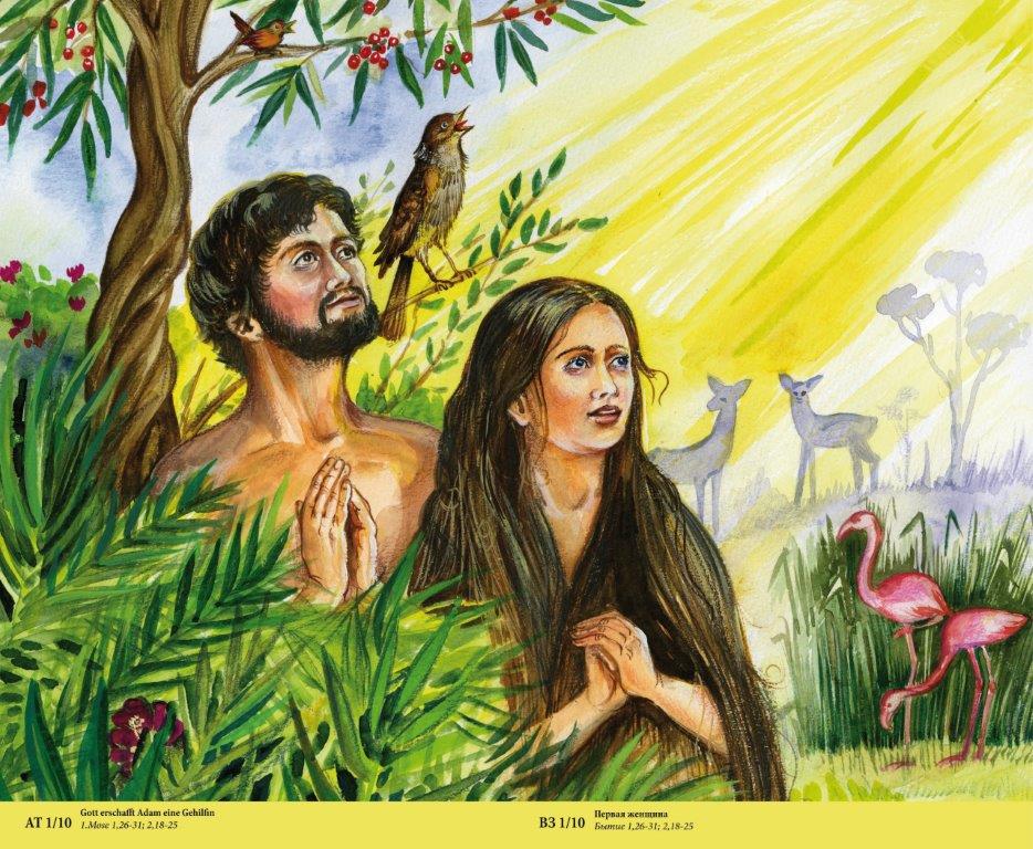 Illustrationen aus "Entdecke die Bibel", ergänzt mit neuen Szenen für die Kinderarbeit. Farbig, doppelseitig bedruckt, laminiert, in einer Folientasche. Die Bildunterschriften und Bibelstellenvermerke sind in deutscher und russischer Sprache.