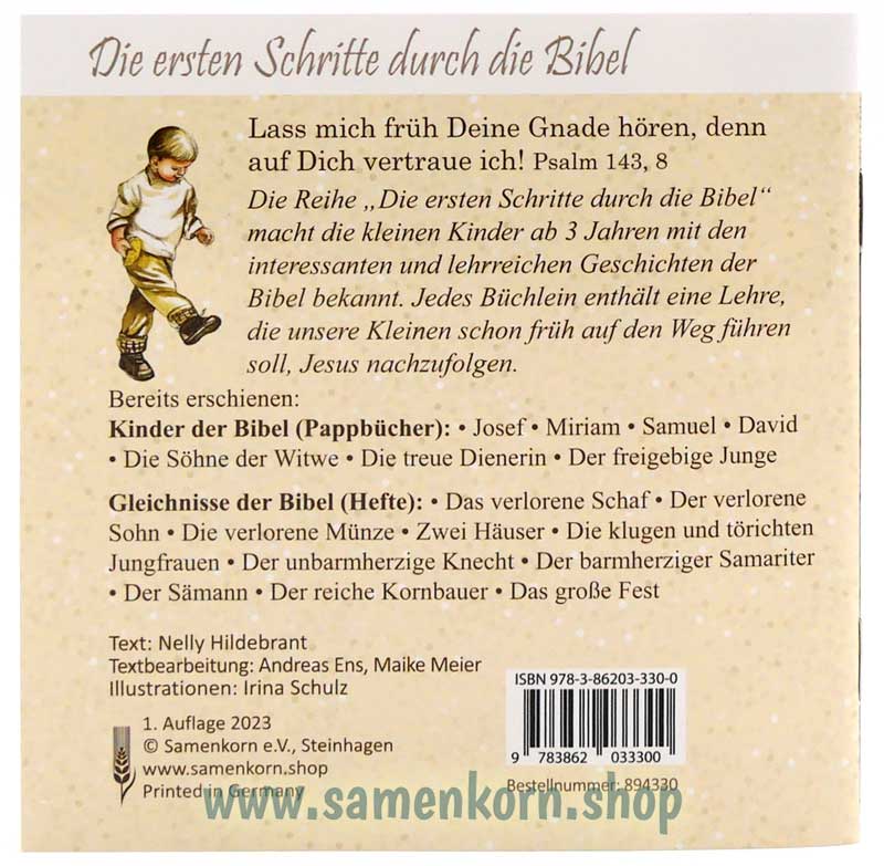 Die Reihe "Die ersten Schritte durch die Bibel" macht die kleinen Kinder ab 3 Jahren mit den interessanten und lehrreichen Geschichten der Bibel bekannt. Jedes Büchlein enthält eine Lehre, die unsere Kleinen dazu ermutigt, Gott zu vertrauen. Mit wunderschönen Bildern.