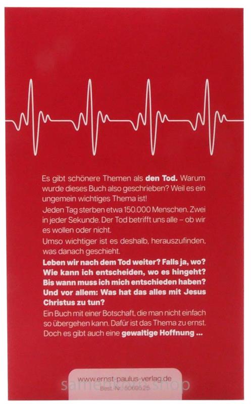 Es gibt schönere Themen als den Tod. Warum wurde dieses Buch also geschrieben? Weil es ein ungemein wichtiges Thema ist! Jeden Tag sterben etwa 150 000 Menschen. Zwei in jeder Sekunde. Der Tod betrifft uns alle – ob wir es wollen oder nicht. Umso wichtiger ist es deshalb, herauszufinden, was danach geschieht. Leben wir nach dem Tod weiter? Falls ja, wo? Wie kann ich entscheiden, wo es hingeht? Bis wann muss ich mich entschieden haben? Und vor allem: Was hat das alles mit Jesus Christus zu tun?