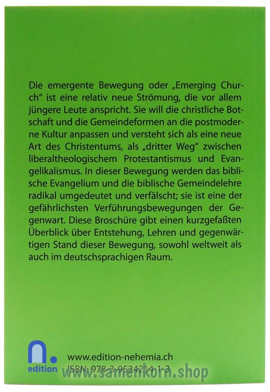 Die emergente Bewegung oder "Emerging Church" ist eine relativ neue Strömung, die vor allem jüngere Leute anspricht. Sie will die christliche Botschaft und die Gemeindeformen an die postmoderne Kultur anpassen und versteht sich ais eine neue Art des Christentums, als "dritter Weg" zwischen liberaltheologischem Protestantismus und Evangelikalismus. In dieser Bewegung werden das biblische Evangelium und die biblische Gemeindelehre radikal umgedeutet und verfälscht; sie ist eine der gefährlichsten Verführungsbewegungen der Gegenwart.