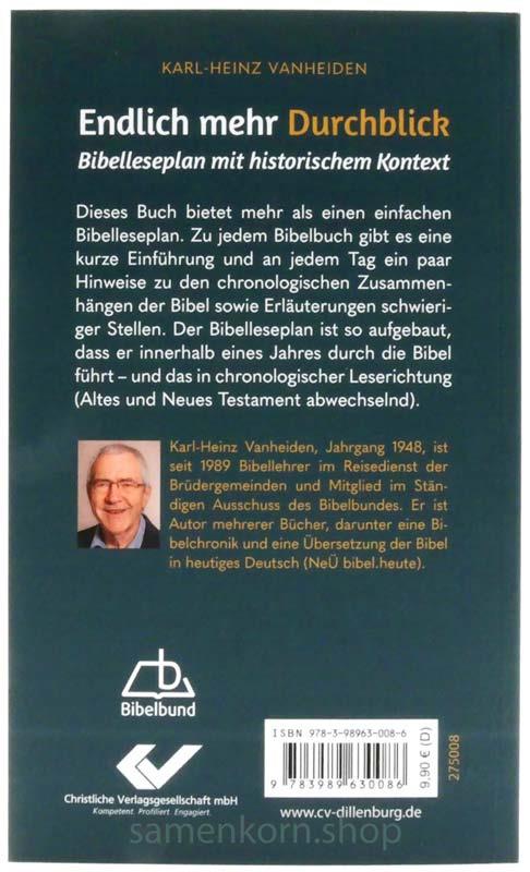 Dies ist mehr als ein einfacher Bibel-Leseplan. er bietet Einblicke in die chronologischen Zusammenhänge der Bibel, Erläuterungen schwieriger Bibelstellen, eine Einführung sowie Schlüsselwort und -verse für jedes Buch der Bibel.