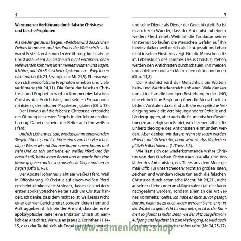 Dieses Heft behandelt folgende Themen: Warnung vor Verführung, falsche Christusse und Propheten, Kriege, Hungersnöte, Seuchen, Katastrophen, Christenverfolgung, Abfall vom Glauben, Weltmission, Israel und die Wiederkunft Jesu Christi.