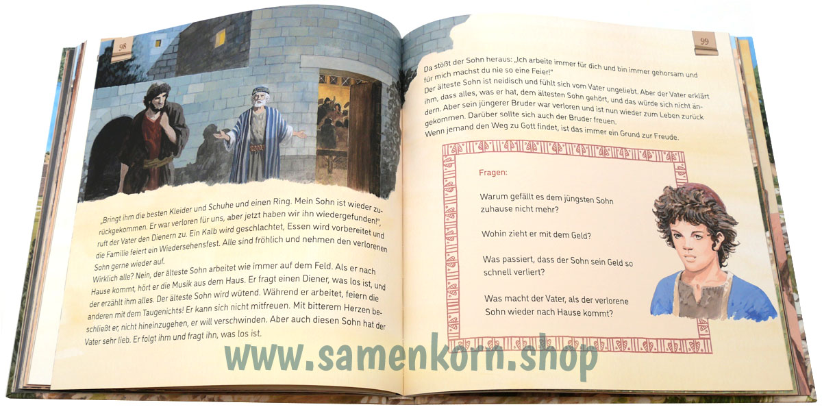 Komm mit in die Geschichten von Jesus. Klettere mit Zachäus auf den Baum, höre die Geschichte vom verlorenen Sohn und ziehe mit Jesus in Jerusalem ein. Denke über Jesu Kreuzigung nach und freue dich über seine Auferstehung.