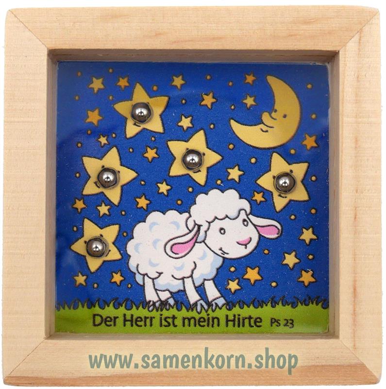 Versuchen Sie die fünf Stahlkugeln in die dafür vorgesehenen Vertiefungen zu befördern, um die Sterne zum Strahlen zu bringen. Mit dem Vers „Der Herr ist mein Hirte“. Im Holzrahmen wird hier Geschicklichkeit, Ausdauer und Koordination trainiert.