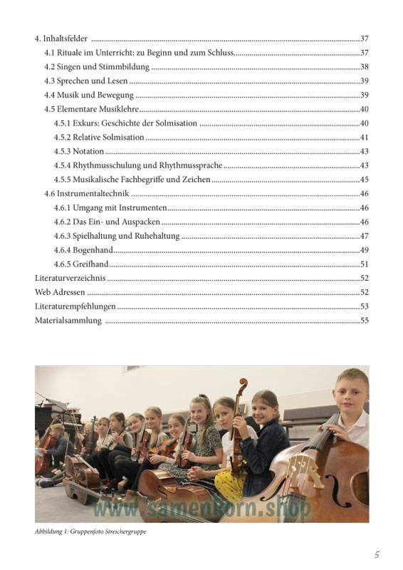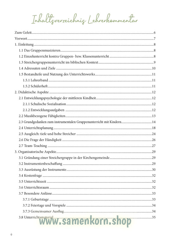 Unterrichtskonzept für den Streichergruppenunterricht mit Kindern ab 7 Jahren im christlichen Umfeld und biblischen Kontext für Violine, Bratsche, Violoncello und Kontrabass. Die Kinder erlernen die musikalischen Grundkenntnisse und die grundlegende Instrumentaltechnik eines Streichinstrumentes. Das Material basiert auf vier biblischen Geschichten: Noah, Mose, Ester und David. Es besteht aus einem Lehrerheft und vier Schülerheften. Alle Lieder, Spiele und Übungen bauen instrumentaltechnisch und musikalisch aufeinander auf und beziehen sich auf die jeweilige Bibelgeschichte. Für Gruppen bis zu 20 Kindern auf eine Kursdauer von 2 Jahren ausgelegt.