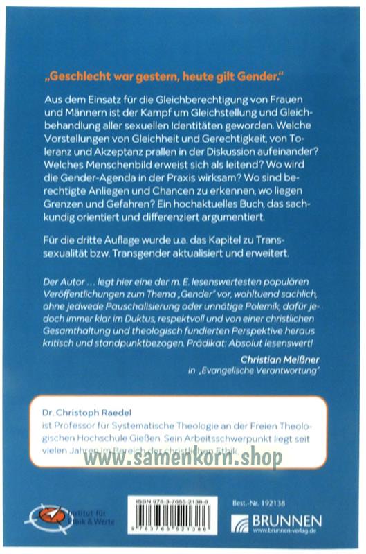 Gender: Chancen, Grenzen und Gefahren. Aus dem Einsatz für die Gleichberechtigung von Frauen und Männern ist der Kampf um Gleichstellung und Gleichbehandlung aller sexuellen Identitäten geworden. Christoph Raedel, Professor für Systematische Theologie und Ethik an der FTH in Gießen, geht den brisanten Fragen nach: Welche Vorstellungen von Gleichheit und Gerechtigkeit, von Toleranz und Akzeptanz prallen in der Diskussion aufeinander? Welches Menschenbild und welche Weltanschauung erweisen sich als leitend? Wo wird die Gender-Agenda in der Praxis wirksam? Wo sind berechtigte Anliegen und Chancen des "Gender Mainstreaming" zu erkennen, wo liegen Grenzen und Gefahren? Ist es wirklich angemessen, von einer "Gender-Ideologie" oder gar von "Genderismus" zu sprechen?