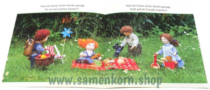 Das Kinderlied "Hast du heute schon Danke gesagt" von Margret Birkenfeld mit Bildern verdeutlicht.