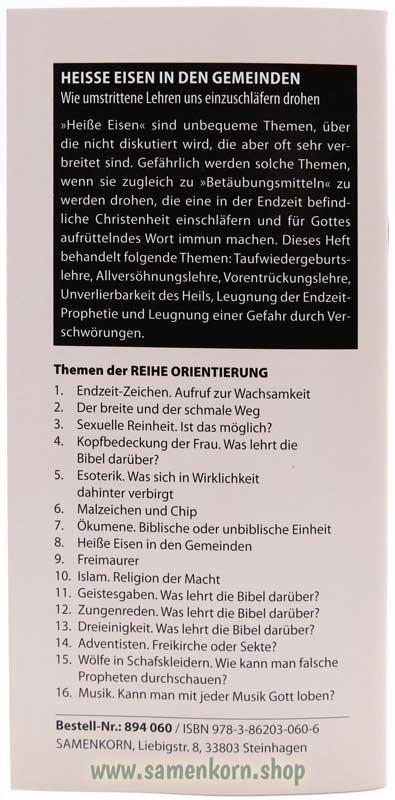 Reihe Orientierung, Bände 1-8 Beiträge zu aktuellen Themen im Lichte der Bibel   Band 1: Endzeit-Zeichen Band 2: Der breite und der schmale Weg Band 3: Sexuelle Reinheit Band 4: Kopfbedeckung der Frau Band 5: Esoterik Band 6: Malzeichen und Chip Band 7: Ökumene Band 8: Heiße Eisen in den Gemeinden