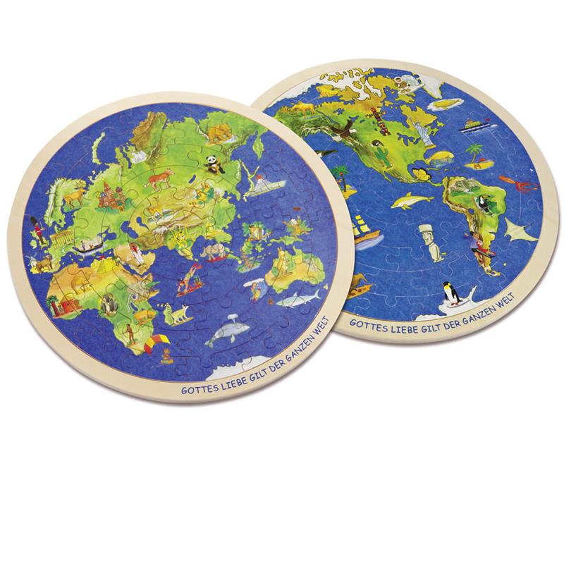 Rundes Puzzle aus Holz; die Puzzleteile sind beidseitig bedruckt, damit alle Kontinente gepuzzelt werden können, 57 Teile, ø 30 cm, ab 4 Jahren,