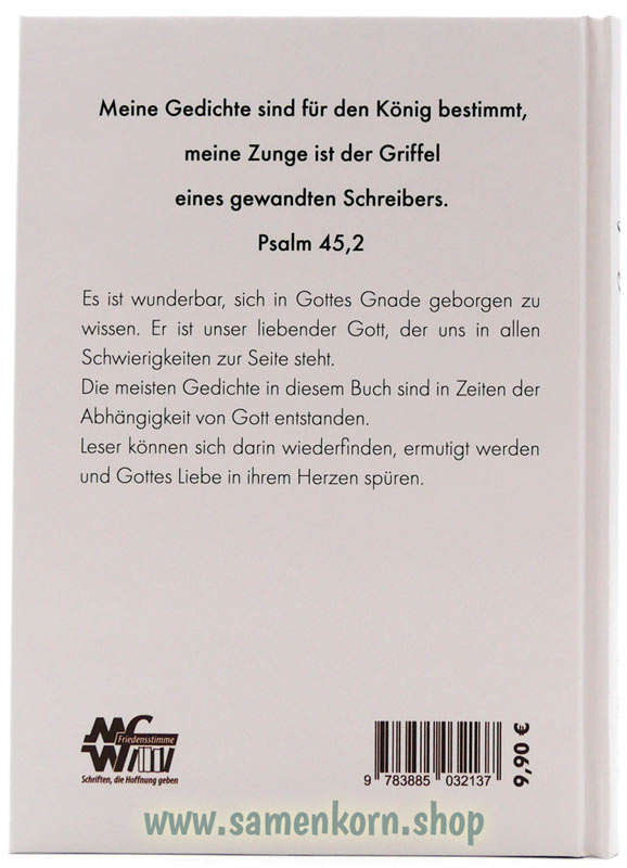 In tiefgehenden Gedichten beschreibt die Autorin die Geborgenheit in Gottes starken Vaterhänden. Gedichte zu Themen wie Anbetung, Auferstehung, Evangelisation, Feste, Gebet, Glaube, Gnade, Gottvertrauen, Himmel, Hingabe, Jesu Leiden, Trost und viele mehr.