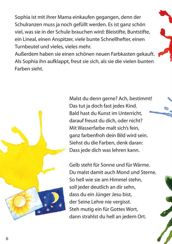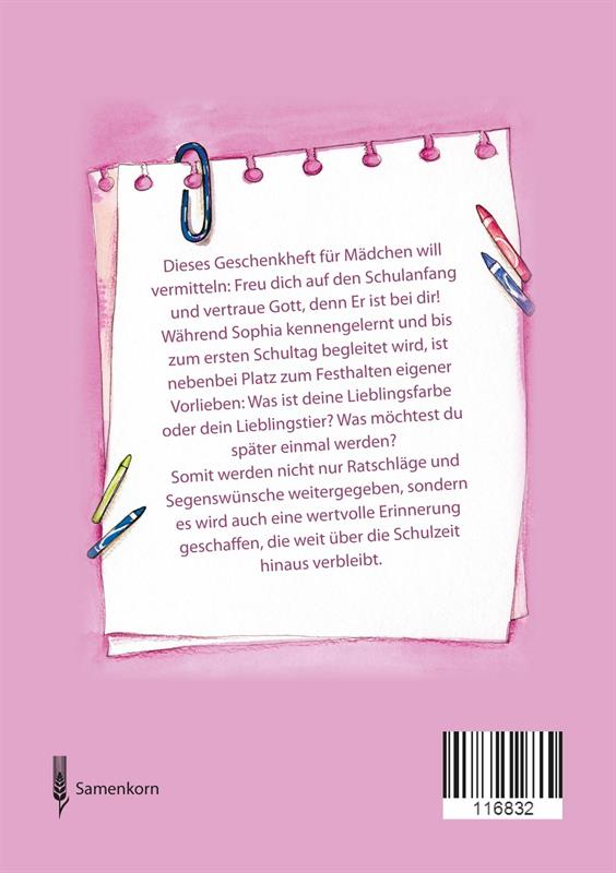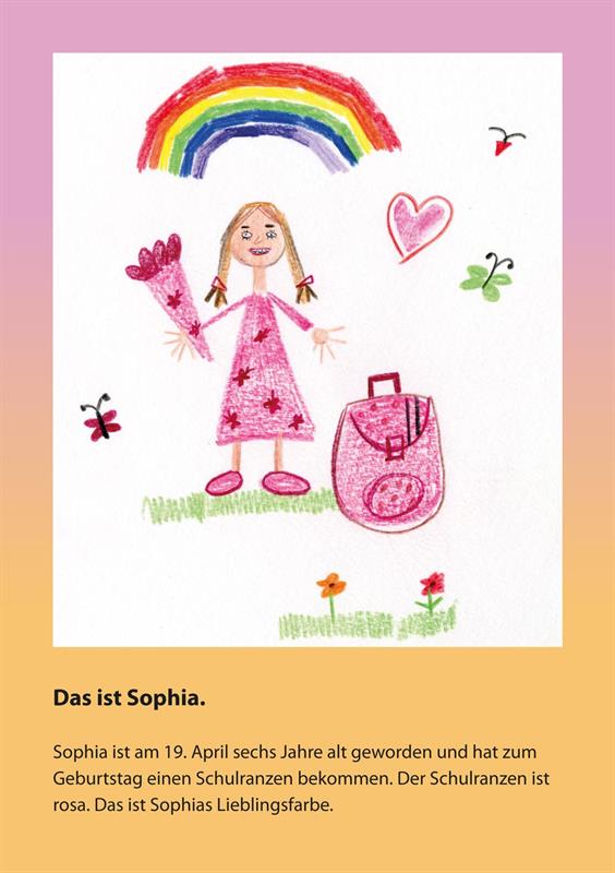 Während Sophia kennengelernt und bis zum ersten Schultag begleitet wird, ist nebenbei Platz zum Festhalten eigener Vorlieben: Was ist deine Lieblingsfarbe oder dein Lieblingstier? Was möchtest du später einmal werden? Somit werden nicht nur Ratschläge und Segenswünsche weitergegeben, sondern es wird auch eine wertvolle Erinnerung geschaffen, die weit über die Schulzeit hinaus verbleibt.