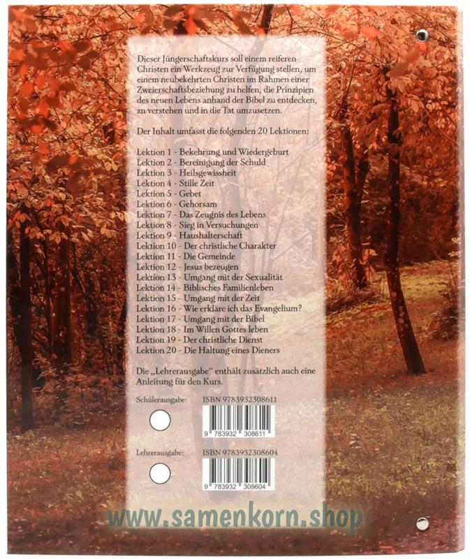 Dieser Jüngerschaftskurs soll einem reiferen Christen ein Werkzeug zur Verfügung stellen, um einem neubekehrten Christen in persönlicher Nacharbeit zu helfen, die Prinzipien des neuen Lebens anhand der Bibel zu entdecken, zu verstehen und in die Tat umzusetzen. Der Inhalt umfasst 20 Lektionen. Ringordner (4 Ringe; DIN A4).