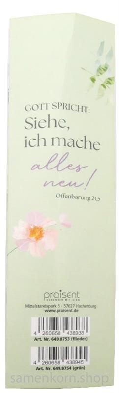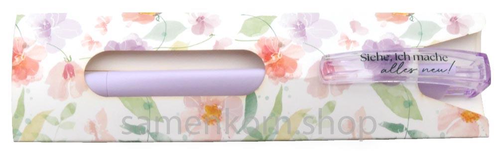Die Jahreslosung 2026 auf einem hochwertigen Kugelschreiber mit Softtouch-Oberfläche in pastelligem flieder. Ergonomische Dreiecksform, bedruckt mit "Siehe, ich mache alles neu!" auf dem transparentfarbenem Clip. Minenfarbe: blau