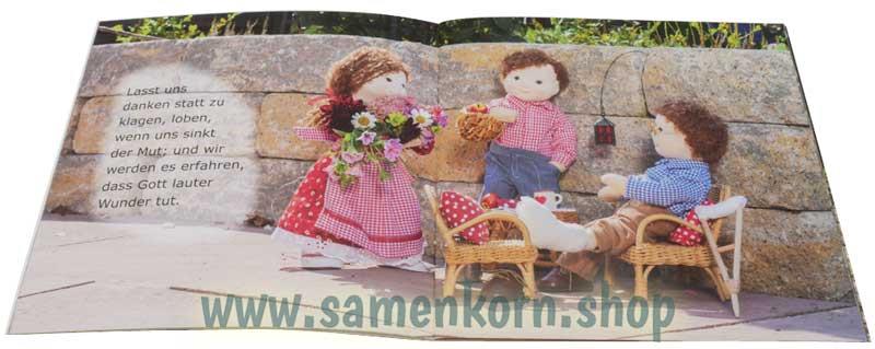 Das Kinderlied "Lasst uns danken statt zu klagen" von Margret Birkenfeld mit Bildern verdeutlicht.