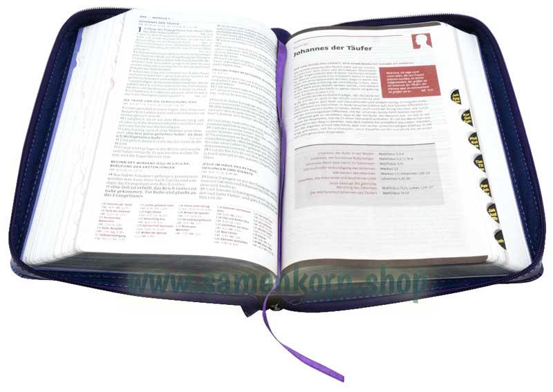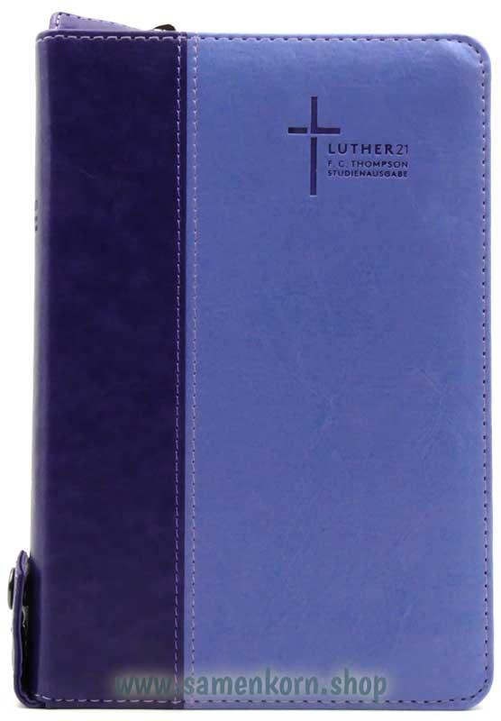 Luther21 F. C. Thompson Studienausgabe, Jugendausgabe, PU Kunstsoff dunkelviolett/violett, Silberschnitt mit Griffregister, Knopfreißverschluss und die Worte Jesu in schwarz, mit Parallelstellen, fadengeheftet