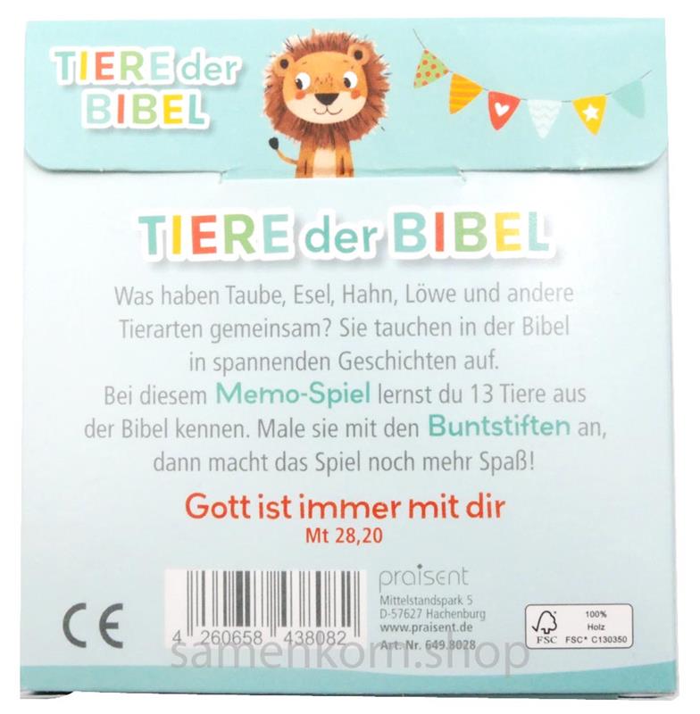 Was haben Taube, Esel, Hahn, Löwe und andere Tierarten gemeinsam? Sie tauchen in der Bibel in spannenden Geschichten auf. Bei diesem Memo-Spiel "Tiere der Bibel" lernen Kinder 13 Tiere aus der Bibel kennen.