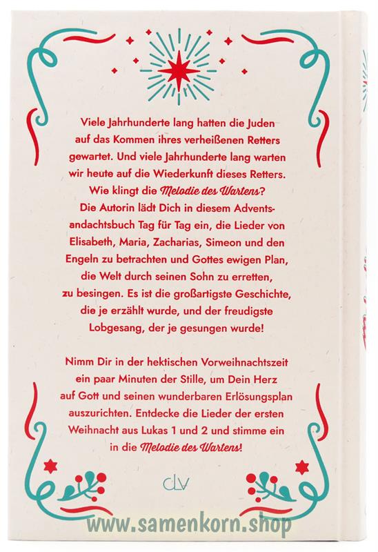 Viele Jahrhunderte lang hatten die Juden auf das Kommen ihres verheißenen Retters gewartet. Und viele Jahrhunderte lang warten wir heute auf die Wiederkunft dieses Retters. Wie klingt die Melodie des Wartens? Die Autorin lädt Dich in diesem Adventsandachtsbuch Tag für Tag ein, die Lieder von Elisabeth, Maria, Zacharias, Simeon und den Engeln zu betrachten und Gottes ewigen Plan, die Welt durch seinen Sohn zu erretten, zu besingen. Es ist die großartigste Geschichte, die je erzählt wurde, und der freudigste Lobgesang, der je gesungen wurde!