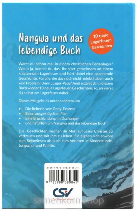 Wer schon einmal in einem christlichen Ferienlager war, kennt das: Man sitzt am knisternden Lagerfeuer und hört dabei eine spannende Geschichte. Aber auch alle, die das noch nicht erlebt haben, werden an diesem Buch ihre Freude haben. Denn „Lager-Papa“ Andi erzählt in diesem Buch zehn spannende Lagerfeuer-Geschichten, wie „Claire, die Reiterin vom Pony-Express“, „Ehrlich währt am längsten“, „Eine Bruchlandung im Dschungel“ und natürlich „Nangwa und das lebendige Buch“.