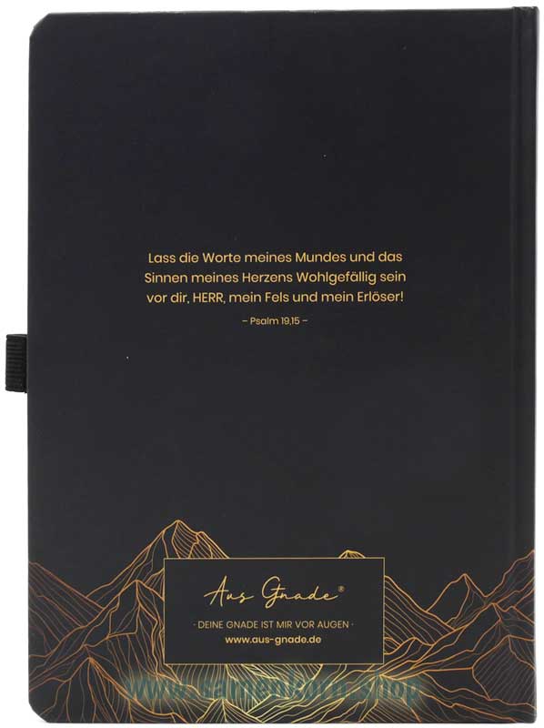 Notizbuch mit der Goldglanzprägung "Der Herr ist mein Fels" auf dem Buchdeckel und dem Bibelvers: "Lass die Worte meines Mundes und das Sinnen meines Herzens Wohlgefällig sein vor dir, HERR, mein Fels und Erlöser! Psalm 19,15"