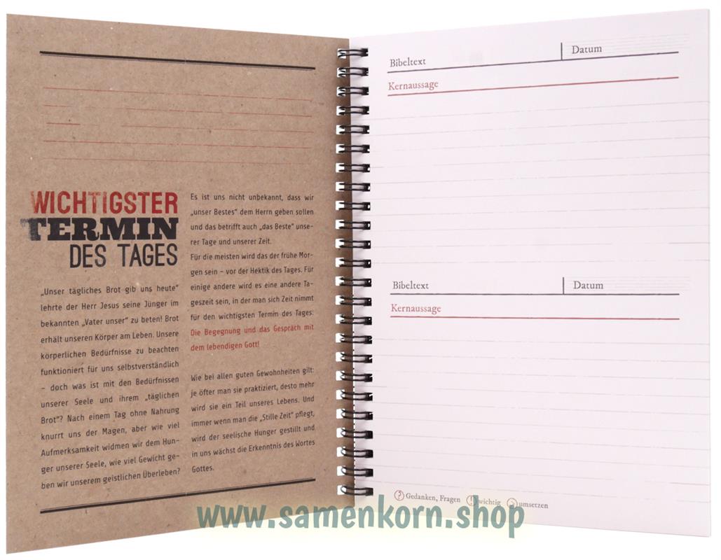 Dieses Tagebuch zur Stillen Zeit ist eine gute Hilfe, sich selbst zu einem regelmäßigen und konzentrierten Bibellesen zu erziehen, denn es ist der wichtigste Termin des Tages. Auf dem Innenteil der Umschlagseiten werden praktische Tipps und Denkanstöße für eine fruchtbare Stille Zeit mit dem Herrn gegeben.