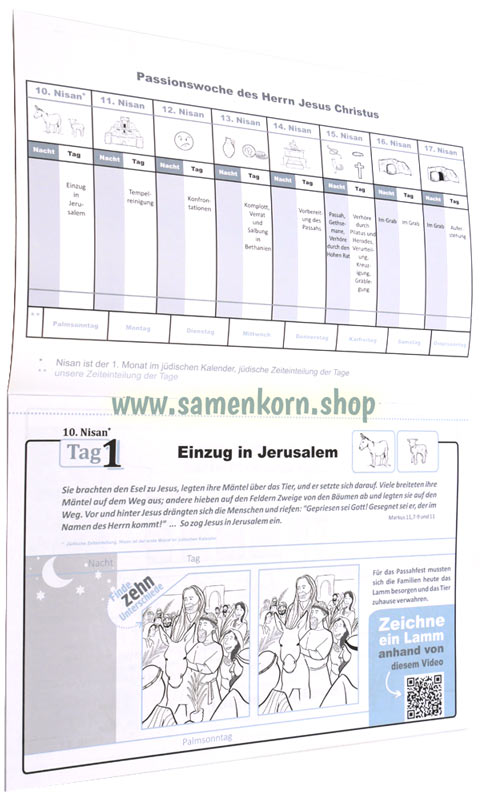 Jeden Tag – 8 Tage lang – können Kinder einen oder mehrere Bibelverse und kurze Erklärungen lesen, Rätsel lösen und manchmal mittels QR-Codes passende Videos auf den Entdeckerseiten ansehen. Schenken Sie Kindern eine wertvolle Woche vor Ostern.