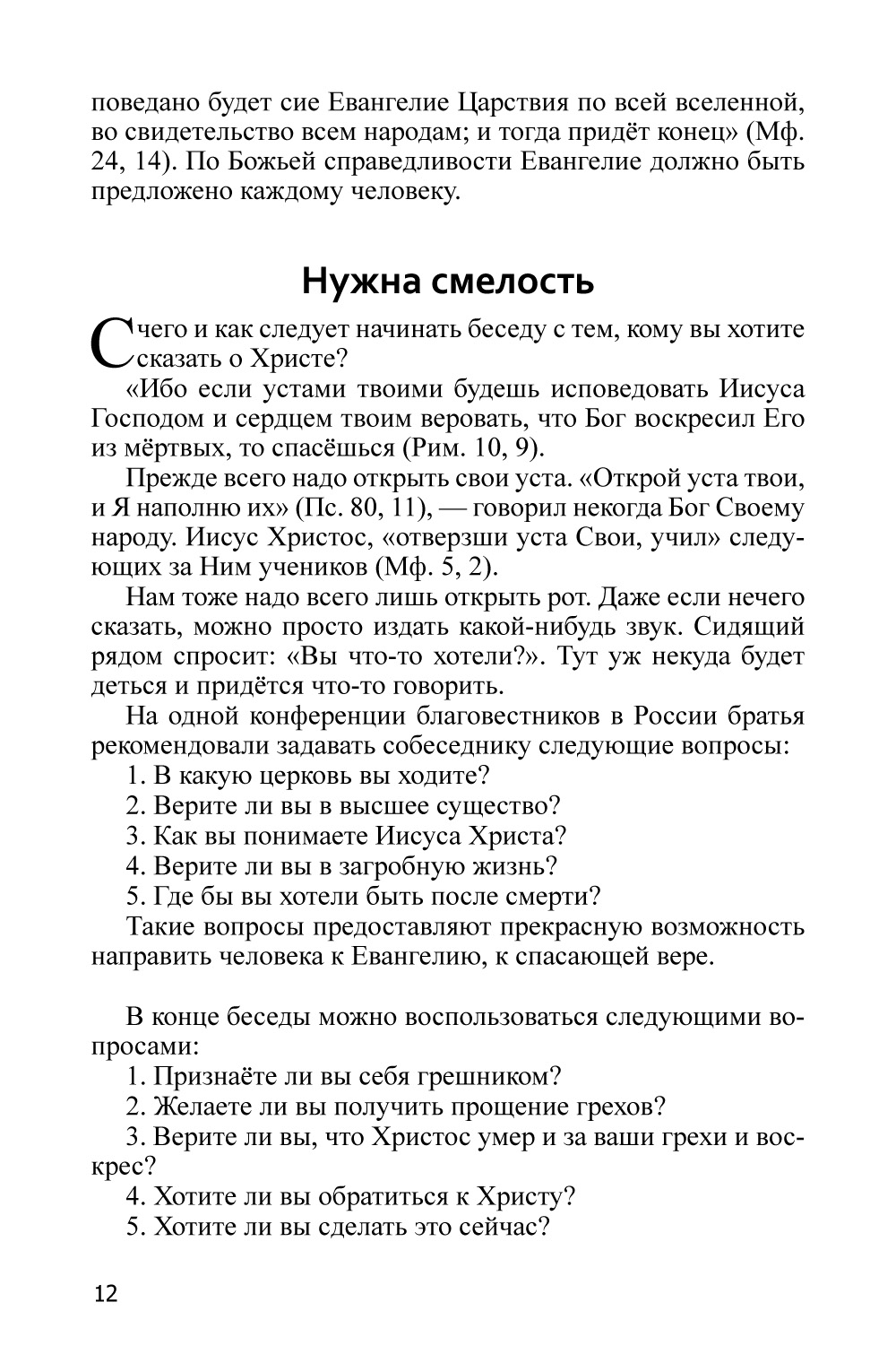 Разговаривать следует с любовью. Полезно занимать позицию учащегося, желающего понять некоторые вопросы. Задать, например, вопрос: «Объясните мне, как вы понимаете это?» Говорить с собеседником на понятном ему языке без превозношения и высокомерия. Держаться темы «Кто такой Иисус Христос?» Благовествуя, мы и сами укрепляемся в вере, упражняем своего внутреннего человека и становимся более твёрдыми в борьбе с плотью.