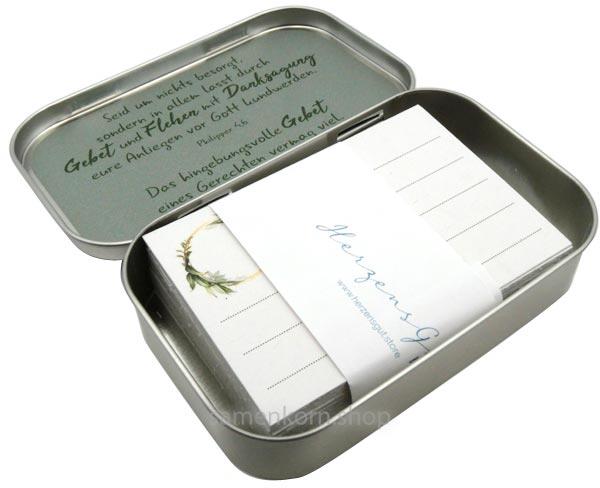 Die Prayerbox bietet dir eine gute und hilfreiche Möglichkeit, Gebetsanliegen zu sammeln und aufzubewahren. Du kannst deine Sorgen, bitten und Danken, vielleicht auch ein Datum, erhörte Gebete und vieles mehr notieren. So kannst du sehr konkret beten und Gebetsanliegen nicht vergessen.