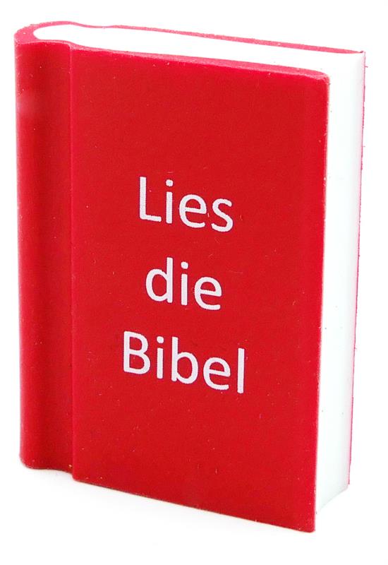 Radiergummi in Buchoptik, mit Text "Lies die Bibel", ca. 4 x 3 cm
