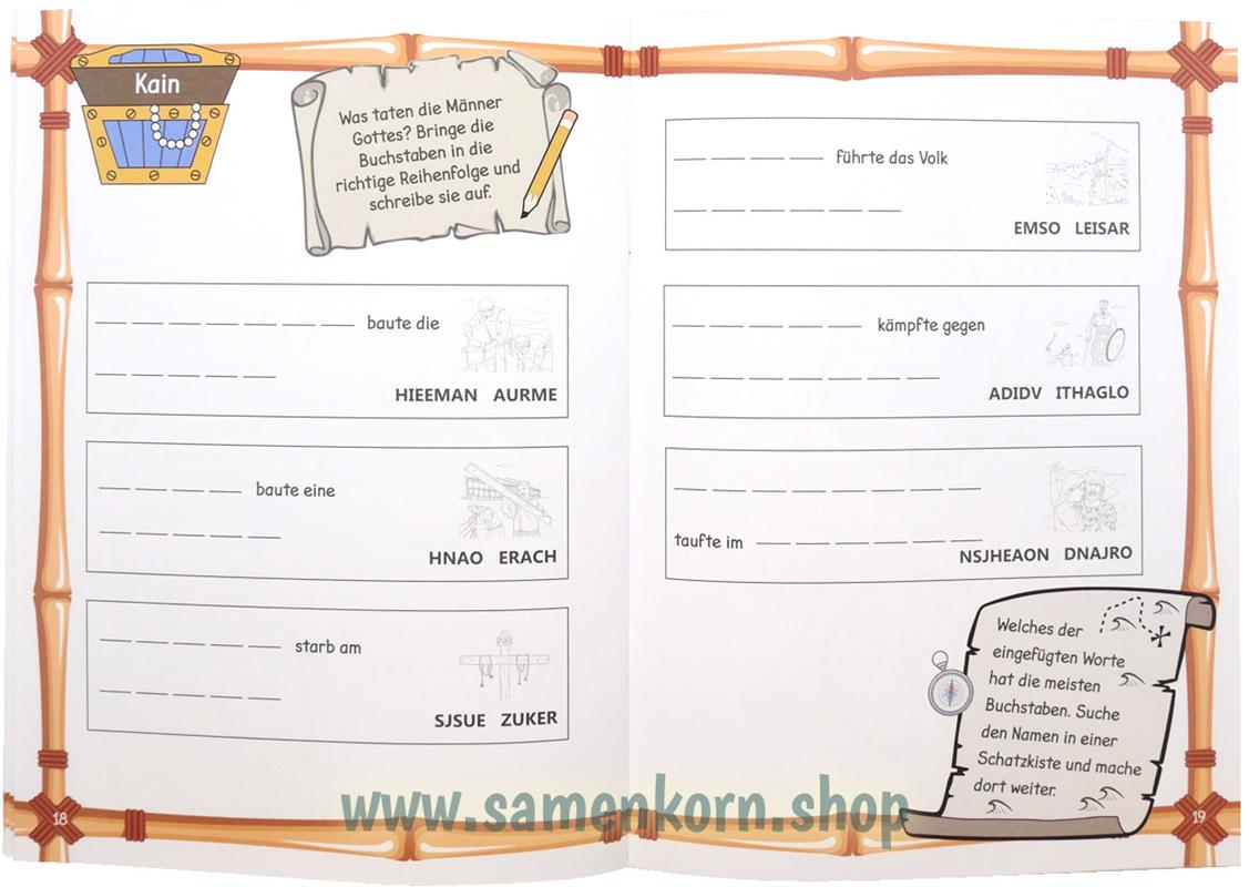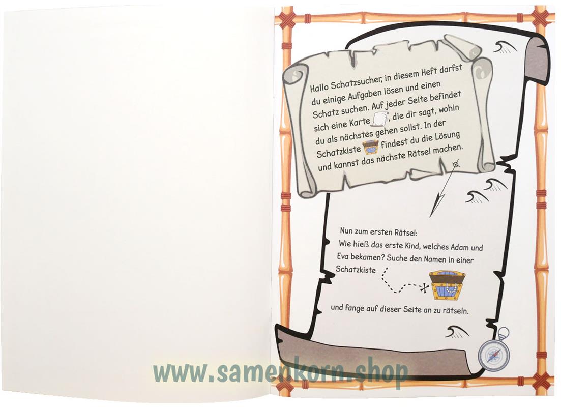 Suche den Silberschatz, indem du verschiedene biblische Rätsel löst. Die Rätsel löst du nicht Seite für Seite wie sonst, sondern darfst einmal quer durch das Heft gehen. In den einzelnen Schriftrollen findest du die entsprechenden Aufgabenstellungen und auch die Anweisungen, auf welcher Seite du jetzt weitermachen darfst.